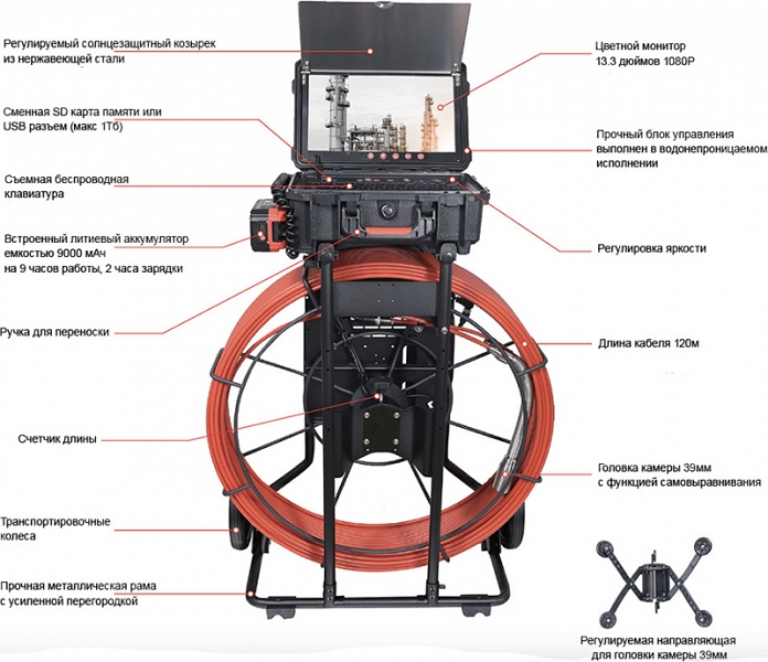 - Головка камеры Ø 39 × 77 мм и проталкиваемый кабель Ø 9 мм × 120 м из стекловолокна со счетчиком длины и системой торможения, подходящие для труб Ø 160 – 400 мм, длиной до 120 м