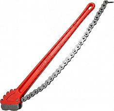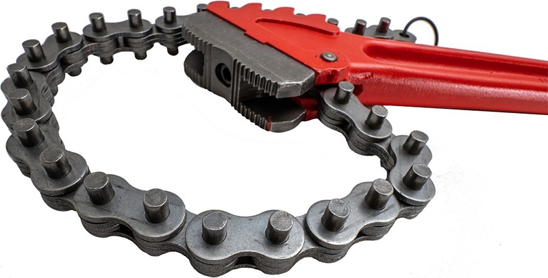 - Прочная цепь из специальной стали c улучшенной термообработкой: пригоняется под трубы всех указанных диаметров; обхватывает трубу по всему радиусу, за счет этого усилие распределяется равномерно по поверхности трубы